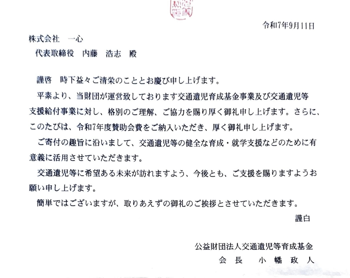 2025年 9月一心は公益財団法人交通遺児等育成基金の賛助会員となりました。 We are pleased to announce that our company has become a supporting member of the Japan Foundation for Children of Traffic Accidents.